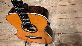 Die massive Alpenfichtendecke aus der Schweiz sorgt für einen warmen, offenen Grundklang mit hervorragender Projektion. Boden und Zargen aus massivem ostindischem Palisander verleihen der Gitarre zusätzliche Tiefe, warme Mitten und langes Sustain – eine klassische Kombination für anspruchsvolle Gitarrist*innen, die Wert auf Natürlichkeit und klangliche Vielfalt legen.