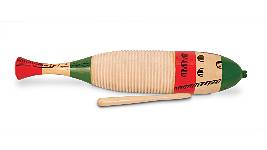 - Ähnlich dem zylinderförmigen Güiro, jedoch in dekorativer Fischform